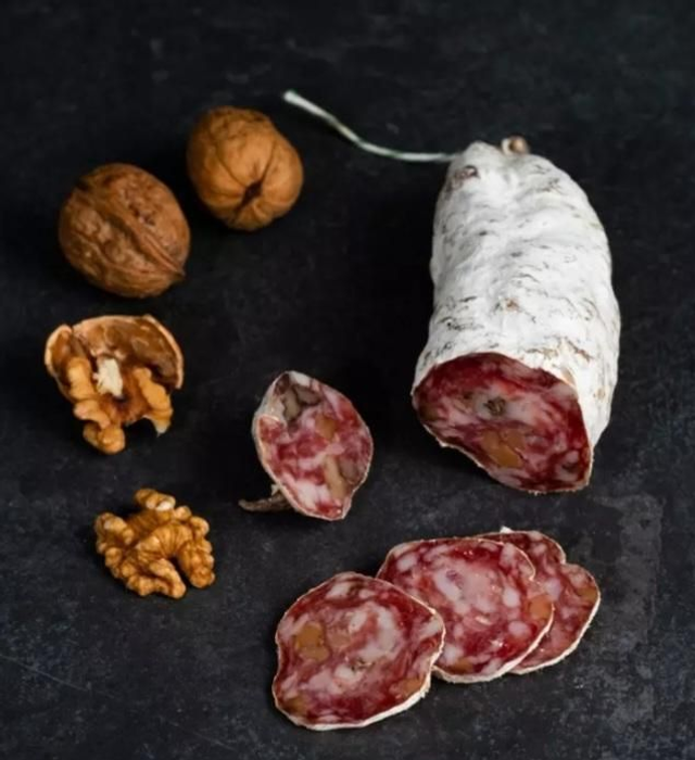 Saucisson aux noix qui croquent sous la dent, toute la saveur du saucisson avec son doux gout de noix.