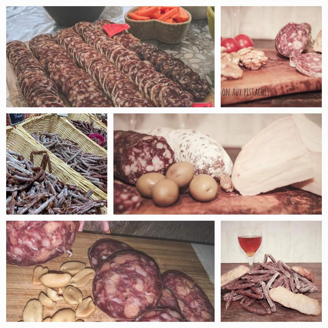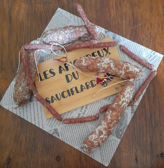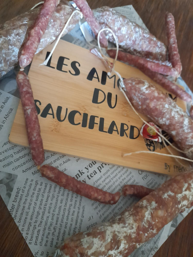 Comprend : ● 1 Planchette de présentation Apéro en bois (Créations SOHTHIZO) (●7,50€ seule) ● 4 Sauciflards différents (●16€ minimum seuls) ● 10 Sauciflettes (●4€ seules) ● 1 surprise ...